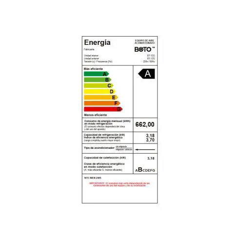 Aire Acondicionado BOTO BT-12G Split 12000 BTU/h (Serie G) ON/OFF