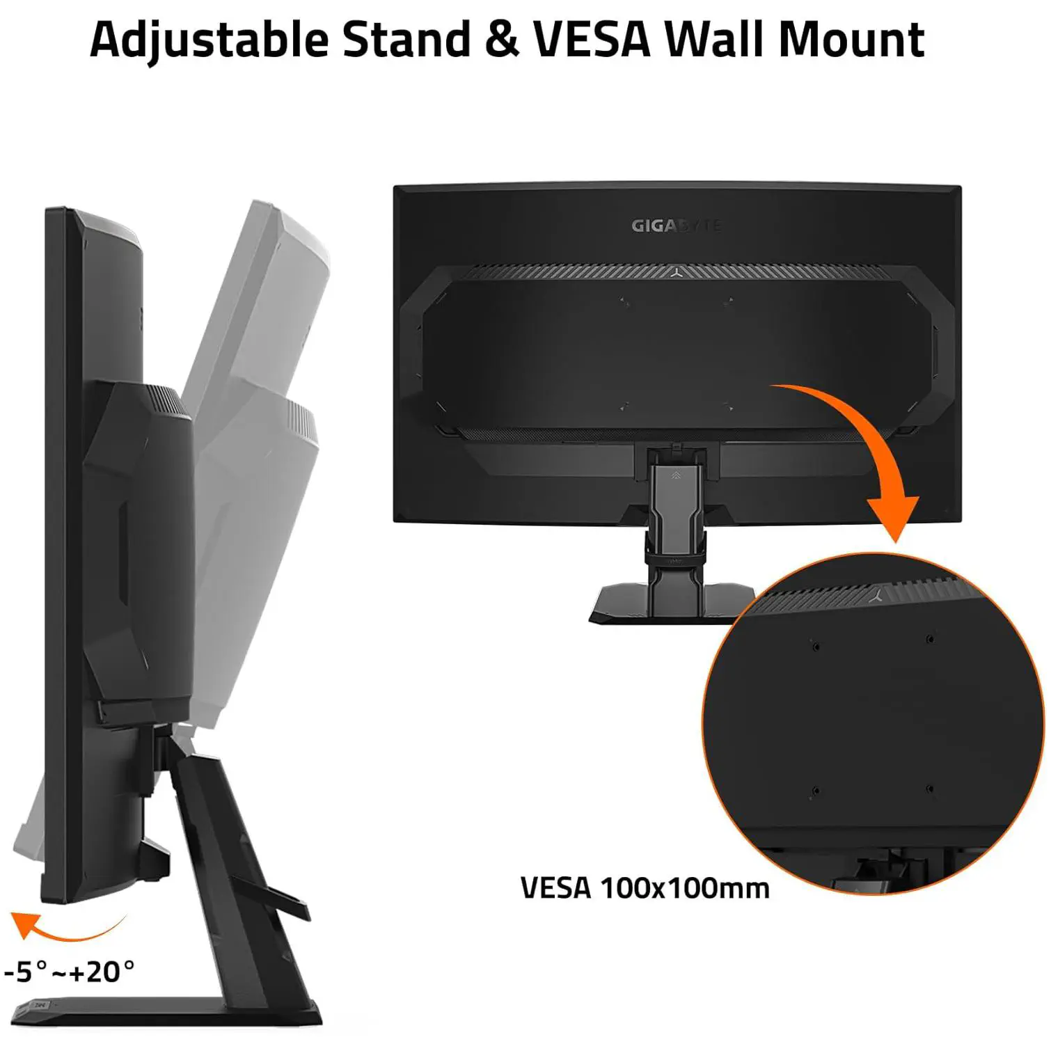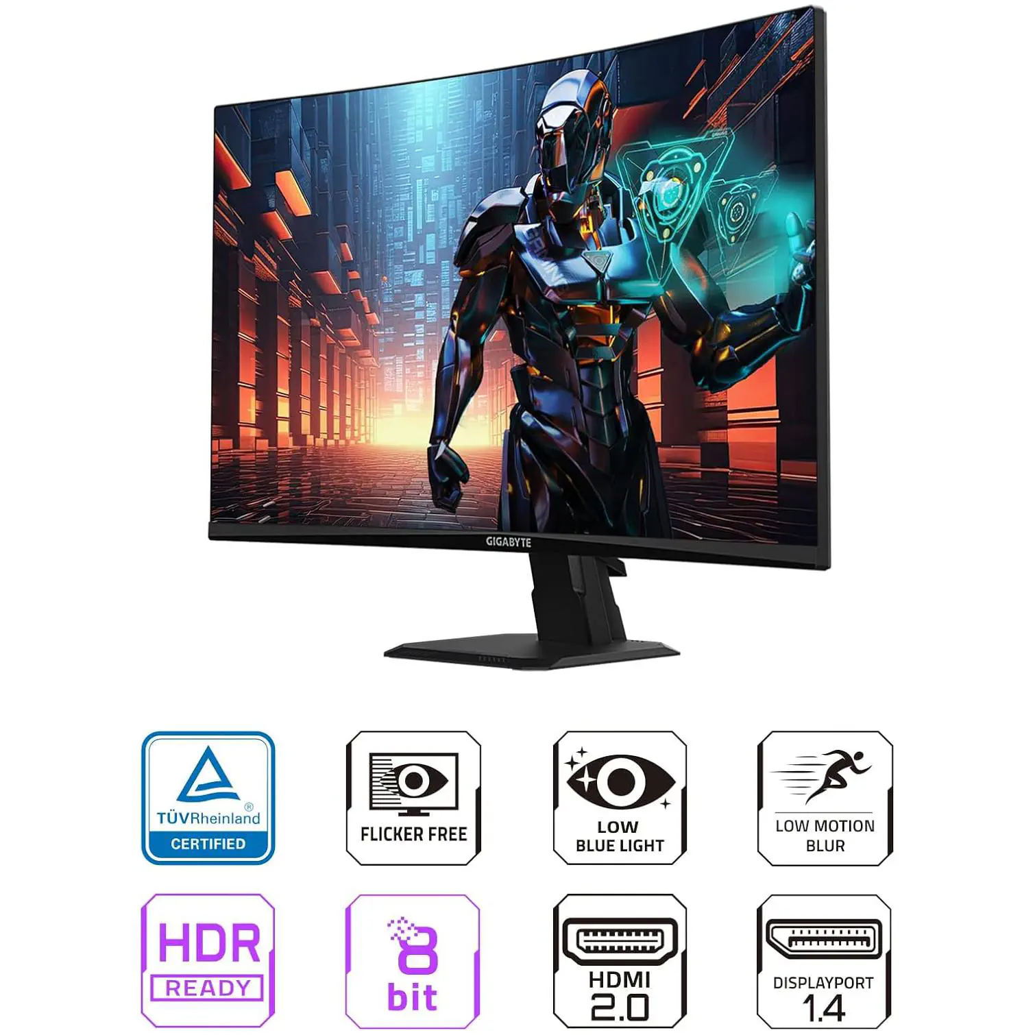 El diseño del Gigabyte GS27QC destaca por su estética elegante y funcional, con bordes delgados y un soporte ergonómico que permite ajustes de inclinación para encontrar la posición de visualización perfecta. Cuenta con certificaciones Eyesafe 2.0 y Flicker-Free para proteger tu vista durante largas sesiones de juego. En cuanto a conectividad, dispone de dos puertos HDMI 2.0 y un DisplayPort 1.4, además de una salida de auriculares de 3.5mm. El monitor también es compatible con el montaje VESA de 100 x 100 mm para una instalación flexible en tu setup.