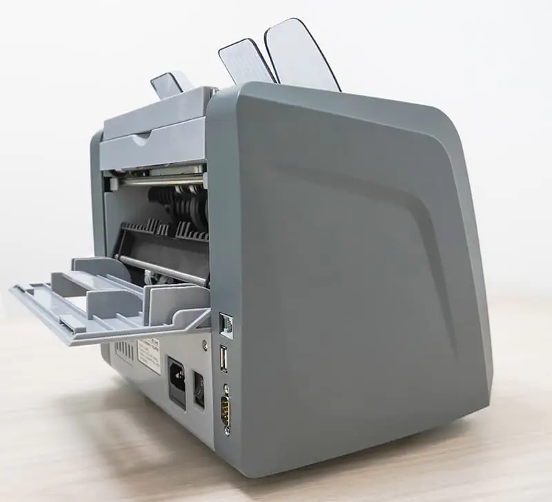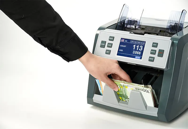 - Detección automática de billetes falsos: UV (ultravioleta), MG (magnético), MT (tinta magnética), IR (infrarrojo)