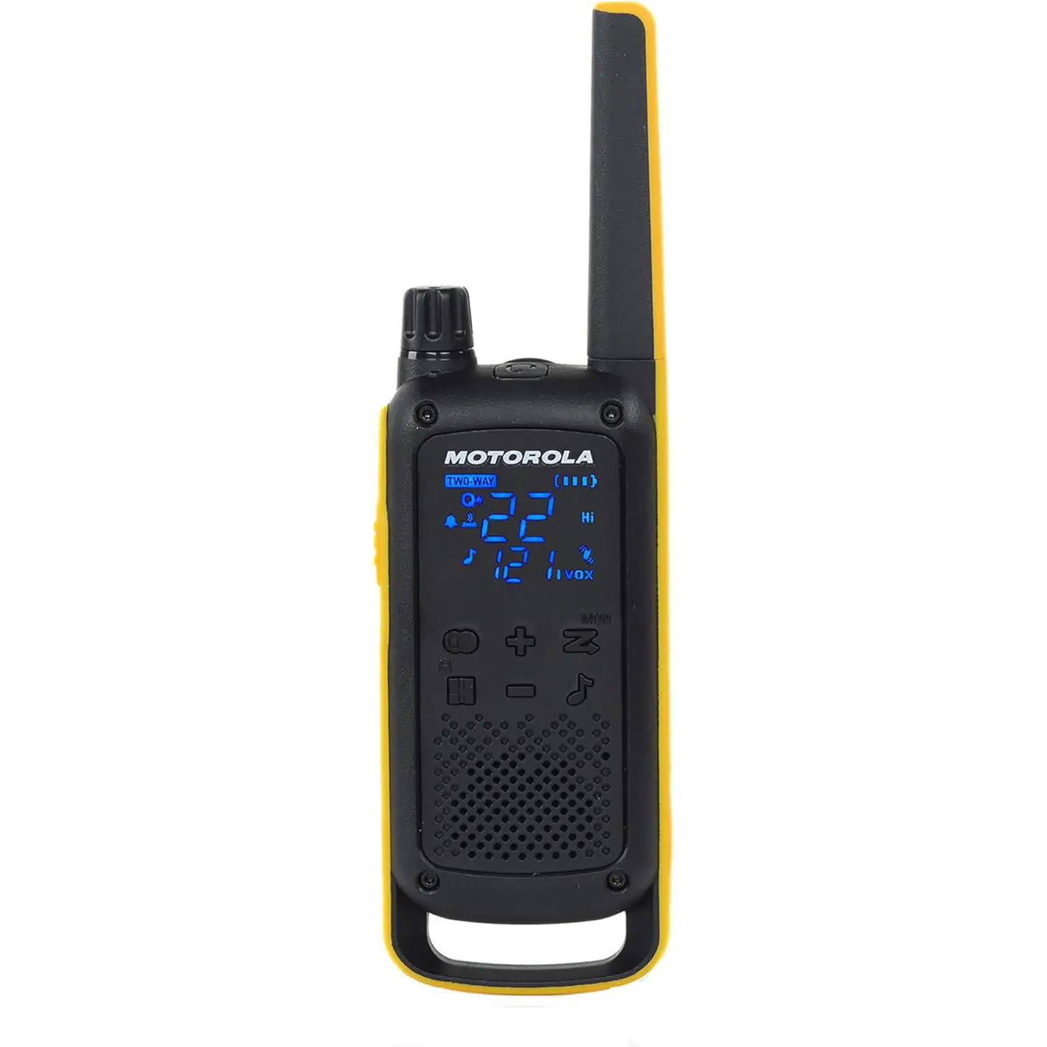 Pack doble de radios bidireccionales recargables Motorola T475. Ideales para actividades al aire libre, con un alcance de hasta 35 millas. Cuentan con 22 canales FRS, 121 códigos de privacidad, canales meteorológicos NOAA y alerta de emergencia. Diseño resistente a la intemperie y linterna LED integrada.